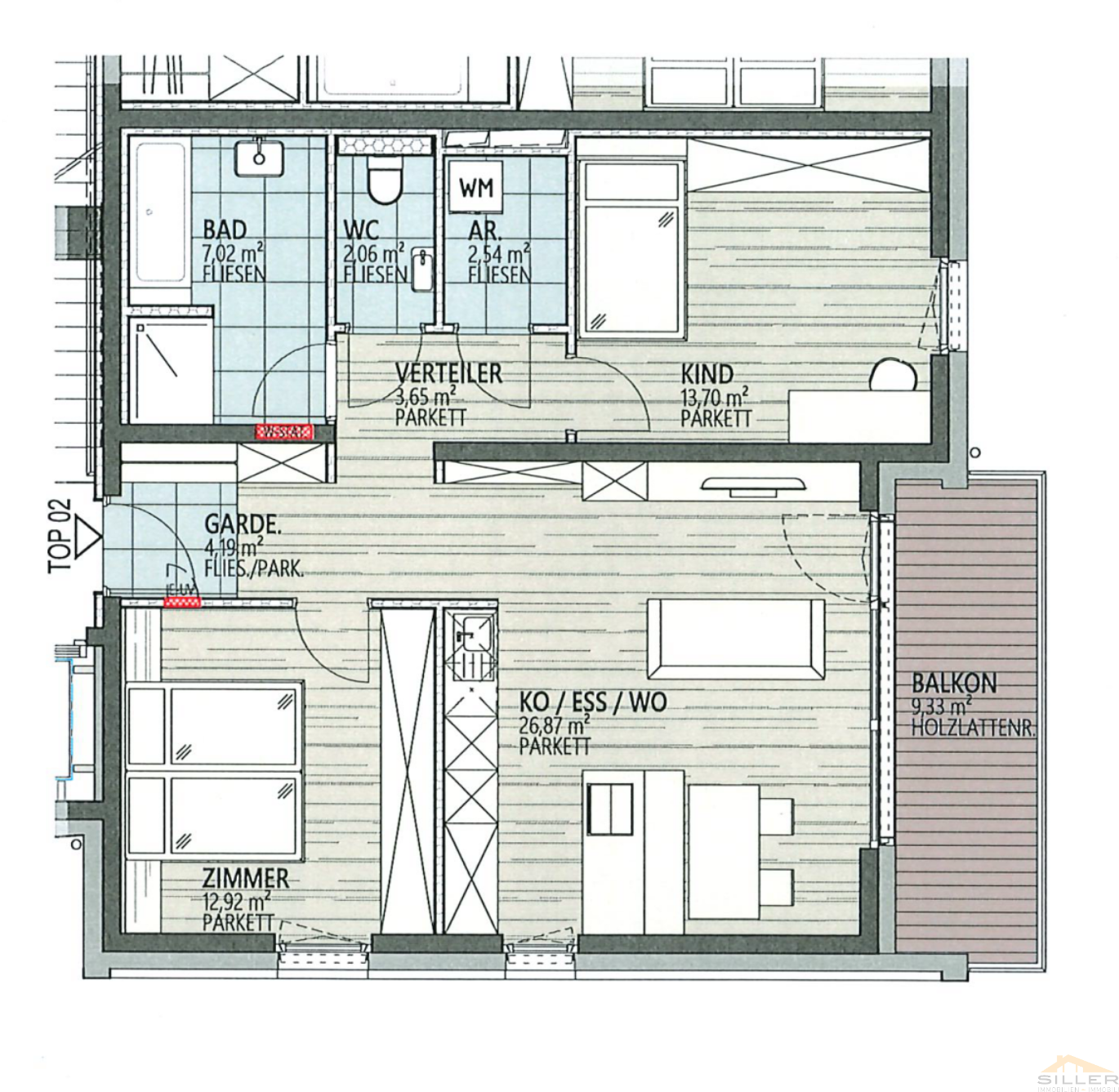 Die Immobilie TOP 02, gelegen im 1. Obergeschoss, besticht durch ihre funktionale und harmonische Raumaufteilung: