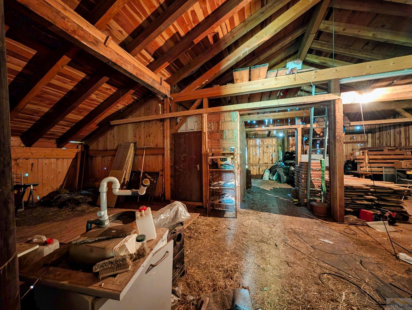 Das 2001-2005 errichtete Gebäude kombiniert gemauertes Erdgeschoss mit traditionellem Holz-Obergeschoss. Im Erdgeschoss befinden sich 100 m² komplett ausgebaute (Stall-)Räumlichkeiten, drei Bädern und schöner Ausstattung mit Holzböden, Granitfensterbänken und Doppelglasfenstern. Die Heizung erfolgt über Holzofen mit Warmwasserspeichertank und das Warmwasser wird elektrisch über einen neuem Warmwasserboiler-System (2023) aufgeheizt.