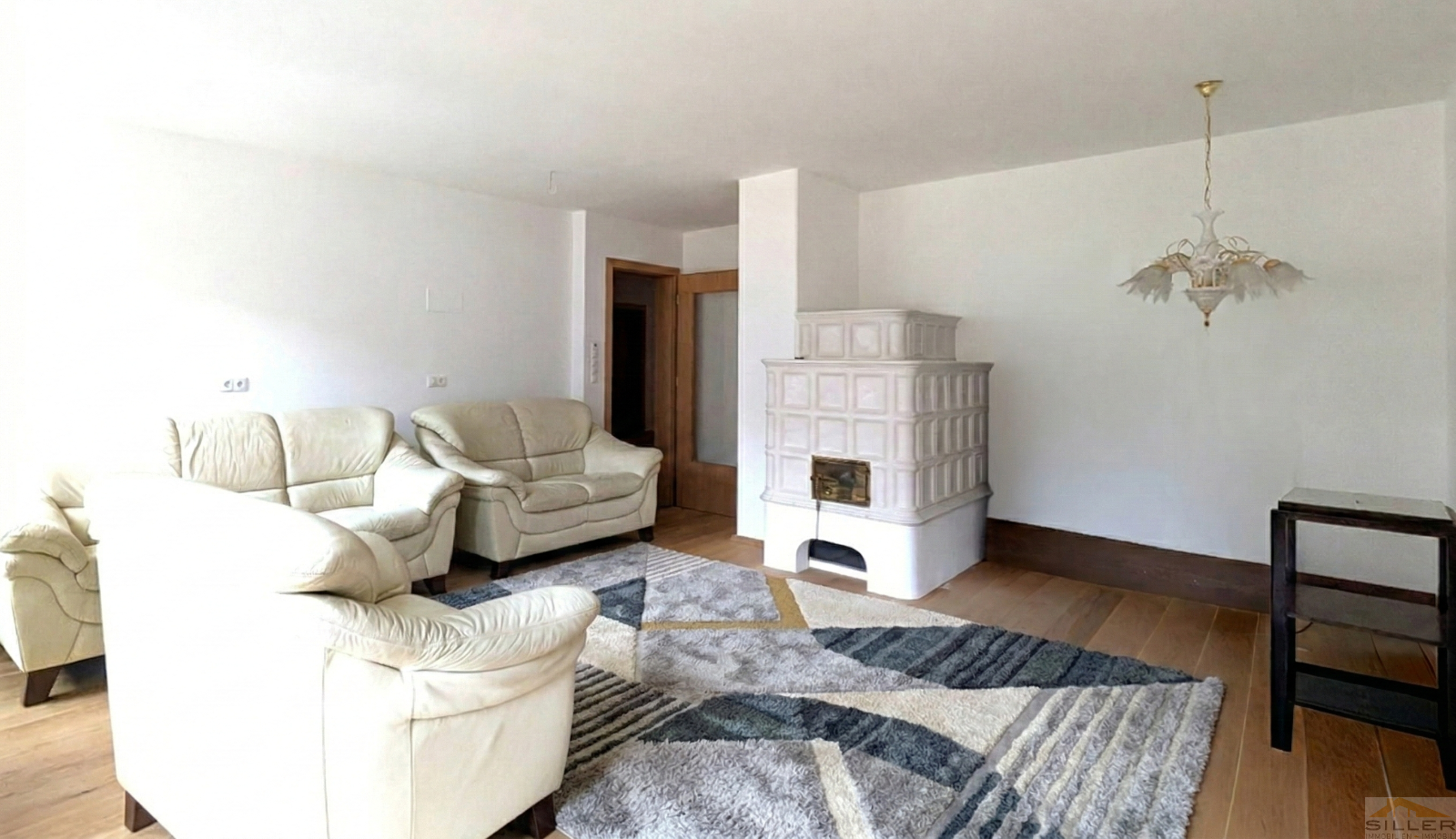 Die Wohnung besticht durch ein großzügiges, lichtdurchflutetes Wohnzimmer mit traditionellem Kachelofen sowie eine separate Wohnküche mit eigenem Speiseraum. Drei gemütliche Schlafzimmer bieten ausreichend Rückzugsraum, während zwei Bäder (eines mit Badewanne, das andere mit Walk-in-Dusche) den Wohnkomfort abrunden.